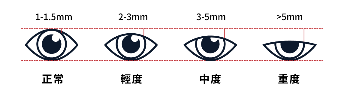 提眼肌無力的輕重程度,可依照上眼瞼遮擋住瞳孔的範圍和距離,區分為輕、中、重度。